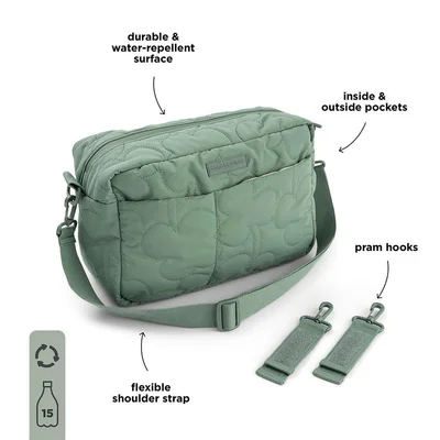 Designed for parents on the move, this compact-yet-roomy stroller bag is perfect for those quick trips when you only need the essentials. Thoughtfully made from recycled PET bottles, it’s as kind to the planet as it is practical. The quilted, clover print finish adds a soft, stylish touch, while clever compartments keep everything organised, from nappies and snacks to bottles and toys. Whether worn over your shoulder or clipped to the pram, it’s the grab-and-go essential every busy day needs.