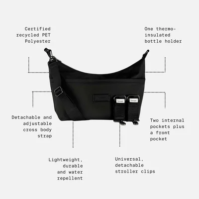 Stay effortlessly organised on every outing with the Finnson Fia Eco Oversized Sling Stroller Organiser. Designed for modern parents, itβs a sleek, versatile solution to keep all your baby essentials close at hand. Crafted from certified recycled PET polyester, this eco-friendly organiser is both durable and water-repellent, protecting your belongings in all weather. The Fia features a thermo-insulated bottle holder to keep drinks warm or cool, a soft grey lining, and multiple pockets to neatly store nappies, bottles, phones, snacks, and more. Use it as a stylish mini changing bag or attach it to your stroller with the included Osten clips - a practical, secure, and hands-free option. The adjustable crossbody strap ensures comfort when worn, while thoughtfully placed compartments make everyday outings easier and more enjoyable.