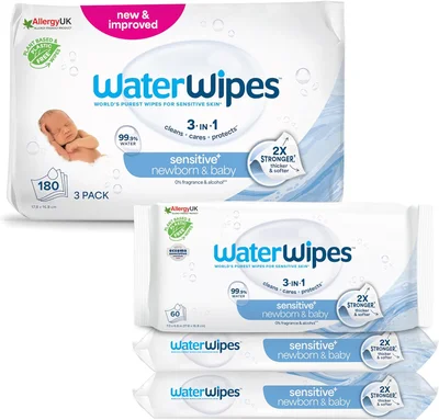 WaterWipes Sensitive+ Newborn & Baby Wipes, 180 Count (3 Packs),...