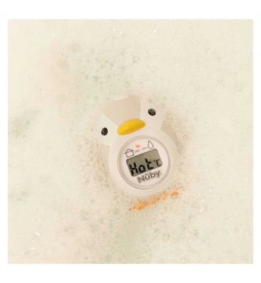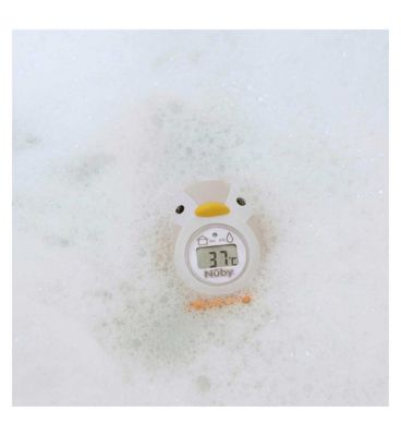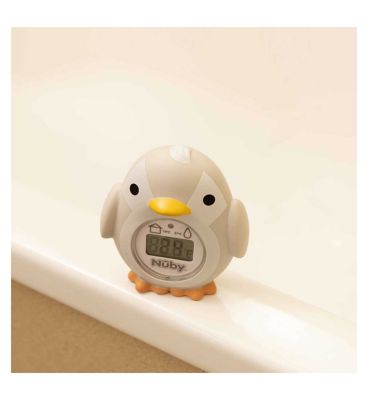 The Nuby Penguin Bath & Room Thermometer is a 2-in-1 device that monitors the temperature of bath water and nursery rooms. Key features: