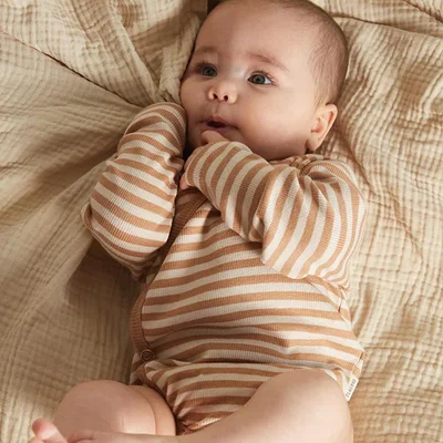 Beautifully soft and thoughtfully made, the Trevi Clay Stripe Wrap Bodysuit is a gentle essential for your baby’s everyday wardrobe. Crafted from a cosy blend of GOTS-certified organic cotton with a touch of stretch, it’s designed to keep your little one comfortable through every wriggle, roll and cuddle. With a clever cross-body wrap and full popper fastening, dressing and changing is wonderfully fuss-free - perfect for those sleepy newborn moments or quick outfit swaps. The soothing stripe pattern in clay, cream, and dusky lilac brings a calm, earthy feel, while the subtle Milking It graphic adds a playful little nod to baby life. Pair it with the matching leggings for an effortlessly styled, easy-to-wear outfit.