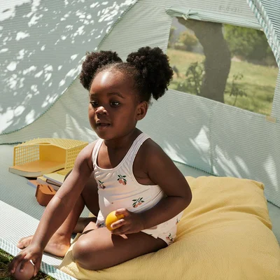 Let your little one shine in the sun with the Liewood Amara Baby Swimsuit. Made from soft, stretchy, GRS-certified fabric, this classic baby swimsuit is gentle on delicate skin and perfect for long days at the beach or by the pool. Featuring a playful summer-inspired print, a gathered flounce at the waist, and crossed straps at the back, it’s both practical and charming. Fully lined for comfort, and with press buttons at the bottom for easy nappy changes, it’s designed to make every sunny family adventure a breeze.