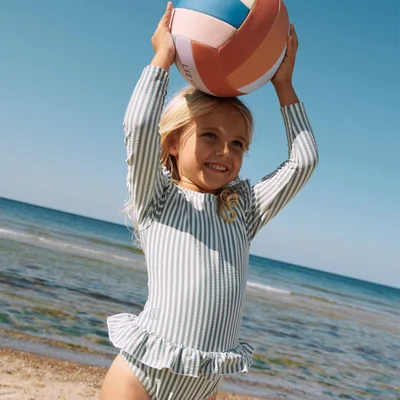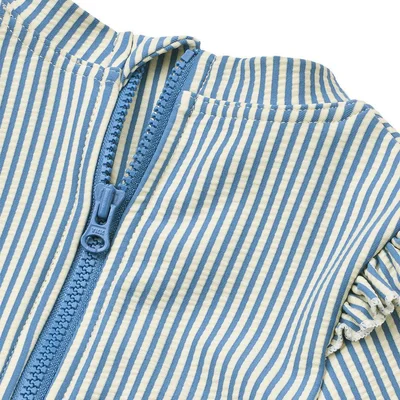 Keep your little one protected and stylish with the Liewood Sille Baby Seersucker Swimsuit. Crafted from quick-drying, GRS-certified seersucker fabric, this long-sleeved swimsuit provides UV40+ sun protection for delicate baby skin. Fully lined for comfort, it features back zip closure and press buttons at the bottom for easy dressing and nappy changes. Sweet ruffle details add a playful touch, making it perfect for sunny pool days, beach trips, or water play.