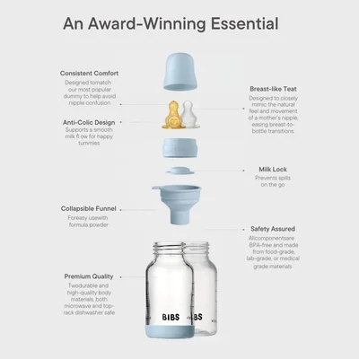 The BIBS Baby Bottle Latex 2 Pack is designed to support your baby’s feeding journey, combining comfort, safety, and practicality in one beautifully crafted design. This award-winning bottle features an anti-colic valve to help reduce gas and reflux, while the soft, breast-like natural rubber latex nipple makes transitioning between breast, bottle, and pacifier seamless. Lightweight and easy for little hands to hold, the durable bottle base is made for everyday use. Thoughtful details, like a spill-preventing milk lock and a foldable funnel for easy formula prep, make feeding at home or on the go effortless. Compete with a medium flow teat - with slow flow and fast flow teats available separately. Made from 100% food-grade, BPA-free materials, this bottle offers a safe and high-quality choice for your little one. Plus, with interchangeable parts across the full collection, you can customise it with different flow rates, accessories, and colours to suit your family’s routine.