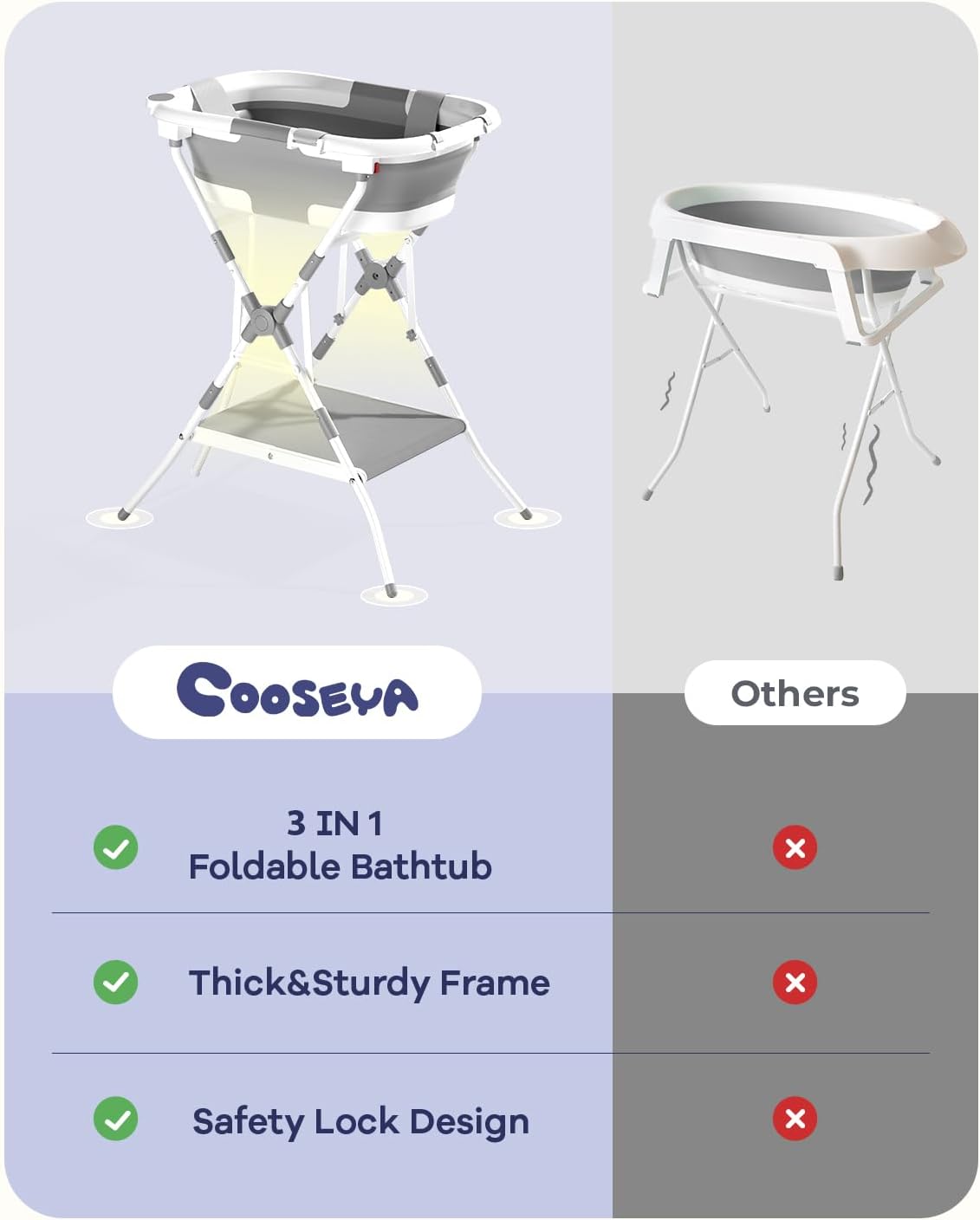 COOSEYA 3 in 1 Baby Bath with Stand, Foldable Baby Bath Tub for Newborn to Toddler with Support Net, Bear and Foldable Design for Travel and Outdoor, Baby Shower Gifts, 0-18Months, Grey