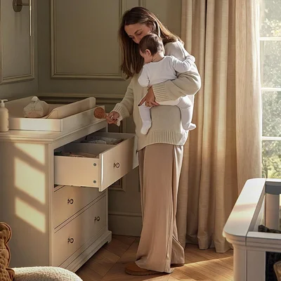 Create a timeless and practical nursery with the CuddleCo Beaumont 2-Piece Set. Designed for families from day one, this elegant set features a convertible cot bed and a matching dresser changer, blending classic period-inspired details with thoughtful, family-focused functionality. The Beaumont Cot Bed grows with your child, offering three adjustable mattress heights and an integrated soft-close drawer for storage. Paired with the dresser changer’s spacious drawers and removable changing top, the set keeps everyday routines simple and organised. Finished in soft white with refined detailing, the Beaumont 2-Piece Set brings a calm, luxurious feel to any nursery and can be complemented with other Beaumont pieces for a complete look.
