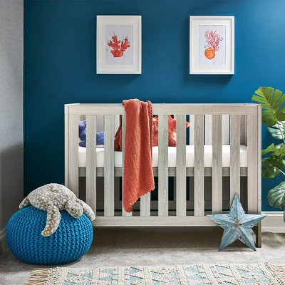 The Obaby Nika Mini Cot Bed in White Wash offers a contemporary design, due to its clean lines and textured oak effect finish, that will fit perfectly in today’s modern nursery. The Nika cot bed has three mattress base positions, the highest allowing you to put down and pick up your newborn without straining your back through unnecessary bending. As your little one starts to develop and become more active, the mattress base can then be lowered by a further two positions keeping them safe and secure at all times while the teething rails protect their delicate first teeth. When your little one is standing confidently, the Nika can be easily transformed into a stylish toddler bed that still offers the familiarity they are used to and helps them to transition in an often-daunting time. Once transformed the toddler bed can be used until they are approximately four years old. Requires an Obaby 140 x 70cm mattress. The Optional mattress choices are fantastic for providing your little ones with optimum support. The Moisture Management Dual Core Mattress offers an impressive four sleep options thanks to the reversible core and cover meaning you can always choose the best combination for a perfect night’s sleep. The Pocket Sprung Mattress features individual pocket springs that are cleverly integrated to give increased support to your little ones' back, neck and head during sleep. Promoting perfect posture and sweet dreams for your little one.