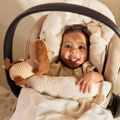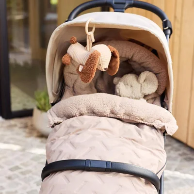 Add a touch of playful charm to every stroll with the Diego Dog Pram Hanger. Made from soft ribbed fabric in a warm biscuit tone, with textured bouclé details in leather brown, this little companion is perfect for keeping your baby entertained on the go. Featuring an embroidered face and a sweet fabric nose, Diego brings personality and comfort to your pram adventures. The plastic ring makes it easy to attach to any stroller, so your little one can enjoy a cosy and stimulating ride wherever you wander.