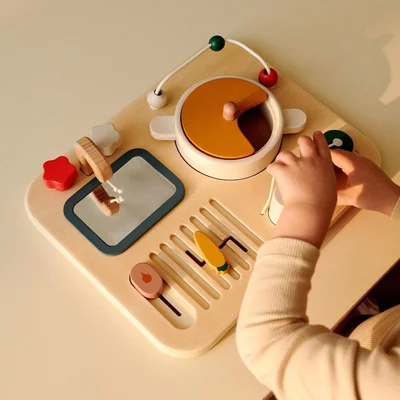 Little chefs can stir, shake, and sizzle their way through imaginative play with the Magnus Wooden Busy Board. Crafted from durable beech wood and MDF, this sensory activity board is perfect for curious toddlers, combining fun with skill-building. From spinning pot lids and moving carrots on the grill to rattling salt and pepper shakers, every detail sparks curiosity and encourages the development of fine motor skills. The playful mirror sink and turnable knobs add an extra touch of hands-on exploration, making mealtime playtime even more magical. Perfect for toddlers 18 months and older, this activity board brings endless sensory fun while inspiring little imaginations.
