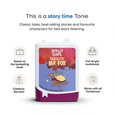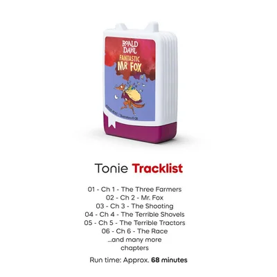 Join Mr Fox, Mrs Fox, and their four little foxes in Roald Dahl’s delightful tale of cleverness and adventure! Every night, Mr Fox sneaks into the valley to outwit the greedy farmers Boggis, Bunce, and Bean, taking food back for his family and friends. Perfect for young listeners aged 6+, this 68-minute Tonie is full of cunning plans, laughter, and thrilling escapades. Pop it onto a Toniebox and dive into a world of problem-solving, creativity, and teamwork – all wrapped up in Dahl’s unmistakable charm. Tracklist: 01. The Three Farmers 02. Mr. Fox 03. The Shooting 04. The Terrible Shovels 05. The Terrible Tractors 06. The Race 07. We'll Never Let Him Go 08. The Foxes Begin to Starve 09. Mr. Fox Has a Plan 10. Boggis's Chicken House Number One 11. A Surprise for Mrs. Fox 12. Badger 13. Bunce's Giant Storehouse 14. Badger Has Debts 15. Bean's Secret Cider Cellar 16. The Woman 17. The Great Feast 18. Still Waitin ⚠ WARNING. All Tonies contain magnets. Please keep them away from medical components such as defibrillators, shunts, or pacemakers as well as from products sensitive to magnets such as magnetic data carriers, credit cards, or computers.